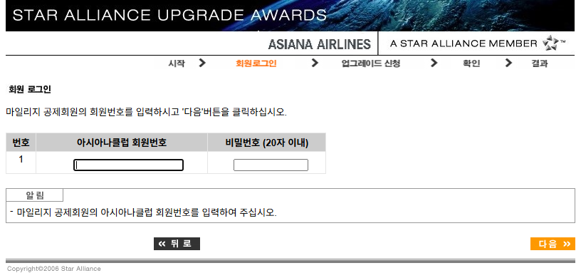 좌석 승급하기를 누르면 새창으로 스타얼라이언스 업그레이드 화면으로 넘어가게 됩니다. 이 화면에서 아시아나 계정으로 로그인하고 항공 예약 정보를 입력하면 됩니다. 저는 아쉽게도 28000마일 밖에 없어서 편도만 업그레이드 할 수 있어요. 아래에 요구하는 정보를 다 넣고 업그레이드 신청하면 수일 내에 결과를 확인 할 수 있습니다.
