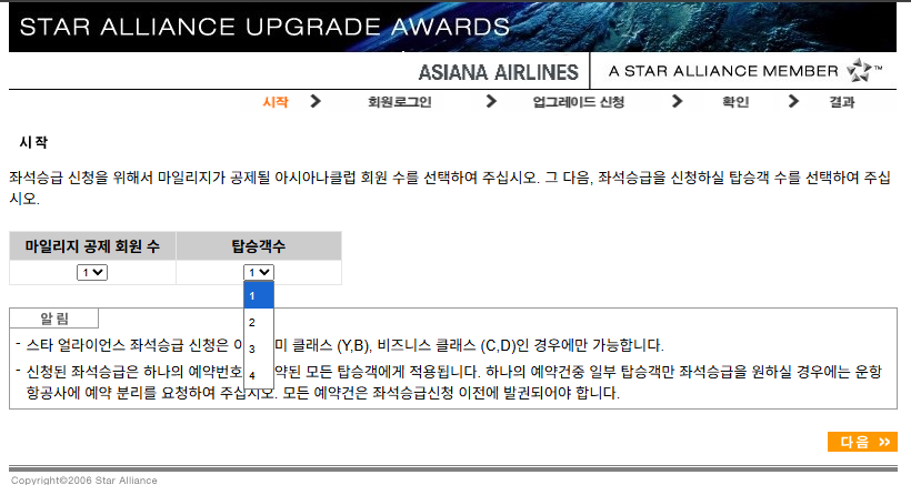 그러면 아래와 같이 마일리지 사용방법이 적힌 화면이 바로 뜨는데요. 예약이 아시아나 항공이냐, 스타얼라이언스 제휴사의 항공이냐에 따라서 좌석승급을 선택해 줍니다. 저는 제휴 항공사로 예약했기 때문에 스타얼라이언스의 좌석승급을 선택했습니다.